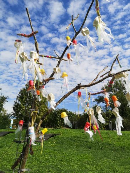 Les enfants ont imaginé une installation hybride et poétique : leur “Arbre à méduses”, présentée lors de la journée événement puis exposée depuis à l’espace Saône Loisirs. Cette œuvre témoigne de leur créativité et de la force d’un projet mêlant art, écologie et territoire